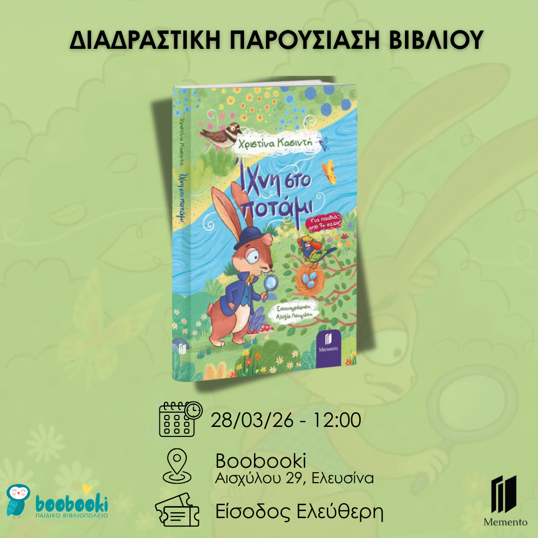 Οι Εκδόσεις Memento σε συνεργασία με το βιβλιοπωλείο Boobooki σας προσκαλούν το Σάββατο 28 Μαρτίου στις 12:00, στην Ελευσίνα, στην παρουσίαση βιβλίου της Χριστίνας Κασιντή ‘’Ίχνη στο Ποτάμι’’.