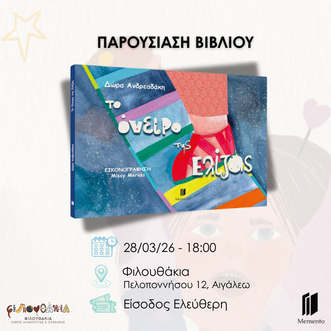 Οι Εκδόσεις Memento σε συνεργασία με το βιωματικό & δημιουργικό εργαστήριο “Φιλουθάκια” πραγματοποίησαν με επιτυχία την παρουσίαση βιβλίου της Δώρας Ανδρεαδάκη, “Το Όνειρο της Ελίζας”! Μαζί μας ήταν η εικονογράφος του βιβλίου, Missy Merida.